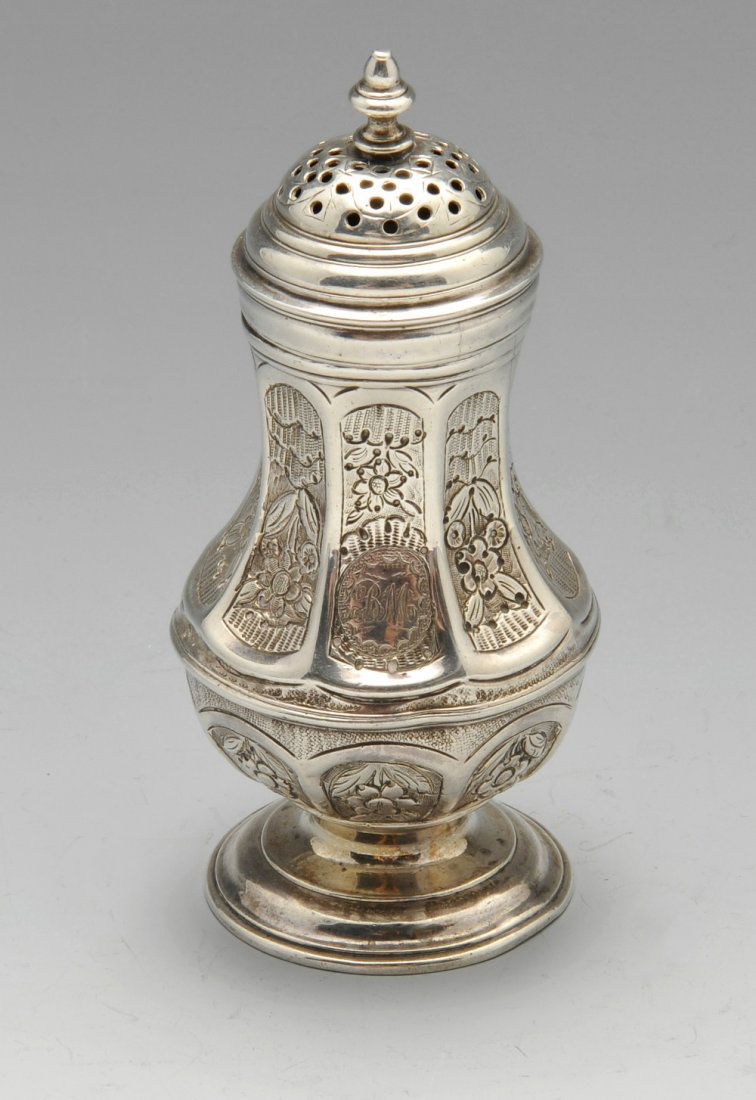 A GEORGE II SILVER BALUSTER SUGAR CASTER23 hrs LeftAN INDIAN SILVER ROSEWATER SPRINKLER GULAB PASH, 19TH CENTURYMar 06, 2026Antique English Sheffield sterling silver muffineer shaker. Hallmarks for Walker & Hall, late 19th5 days Left18th century American colonial silver shaker-muffineer. W.H. maker's marks. Marked twice on coverMar 01, 2026A SET OF THREE GEORGE II SILVER CASTERS MARK OF SAMUEL WOOD, LONDON, 17443 days LeftPair Queen Anne English Silver Casters, Joseph WardFeb 24, 2026English Georgian sterling silver embossed repousse muffineer shaker, London, 1769, George III. 65 days LeftTHREE ENGLISH SILVER CASTERS ONE MARK OF JABEZ DANIEL AND JAMES MINCE, LONDON, 1771, TWO MARK OF3 days LeftCutch circa 1850 A mid-19th century Anglo – Indian unmarked silver rose water sprinkler2 days LeftVeneto region circa 1750 by FA with an eagle in between A mid-18th century Italian silver coffee pot2 days LeftA GEORGE II SILVER SUGAR CASTERMar 03, 2026American Coin Silver Horse Trophy PitcherFeb 25, 2026Dublin circa 1740, no maker’s mark A George II Irish sterling silver beer jug2 days LeftTIME LAMP WITH CLOCKWORK MECHANISM Late 19th/Early 20th Century Height 13".Mar 04, 2026A FRENCH SILVER MOUNTED CUT GLASS EWER23 hrs LeftAntique Silver Plate Hot Water Urn3 hrs Left