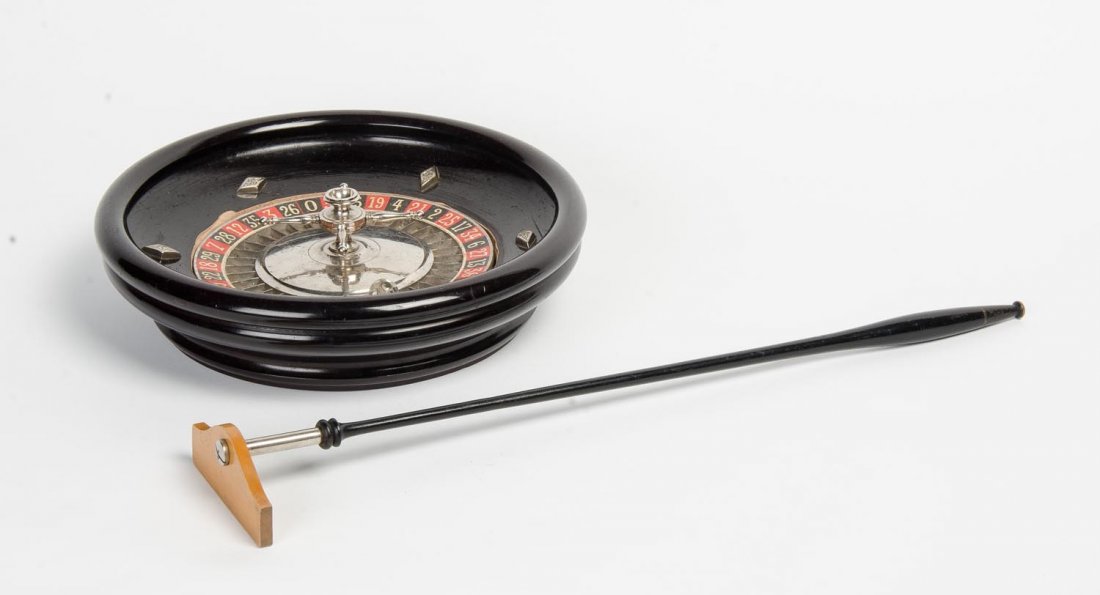 An ebonised and silver plated roulette wheel with