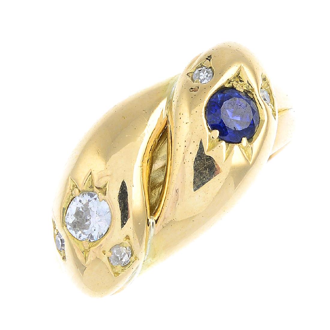 An Edwardian 18ct gold gem-set snake ring. Comprising