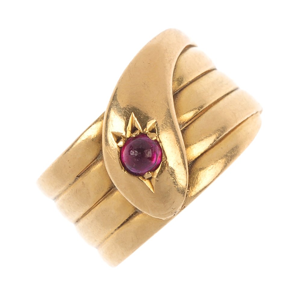 An Edwardian 18ct gold ruby snake ring. The tapered