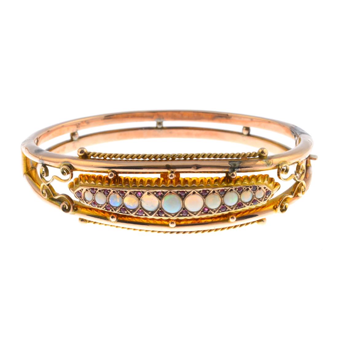 An Edwardian 9ct gold opal and gem-set hinged bangle.