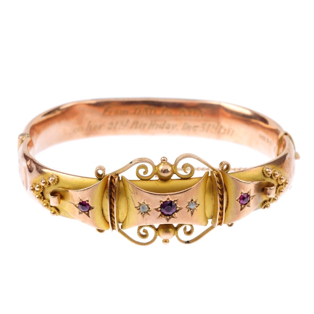 An Edwardian 9ct gold ruby and diamond hinged bangle.