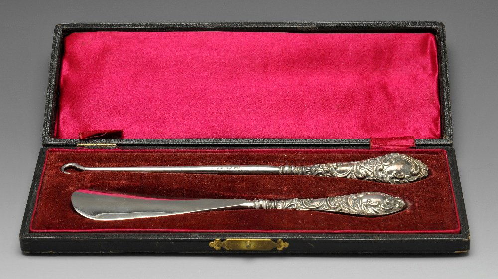 An Edwardian cased silver handled button hook and shoe