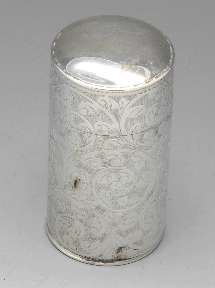 AN EDWARDIAN SILVER BARREL SHAPED POT AND COVERFeb 17, 2026Edwardian Silver Sugar Caster, Mark of Sydney Bellamy Harman3 days LeftCutch circa 1880 A late 19th century Anglo – Indian unmarked silver novelty chess piece pepper potFeb 18, 2026Cutch circa 1890 A late 19th century Anglo – Indian unmarked silver large beakerFeb 18, 2026A SILVER HAMMERED JAR AND COVERFeb 17, 2026English pepper shaker in silver. Late 19th century. From large private collection.A GEORGE III SILVER OVAL TEA CADDYFeb 17, 2026A VICTORIAN SILVER MOUNTED GLASS CLARET JUGFeb 17, 2026A FRENCH ART NOUVEAU SILVER MOUNTED GLASS BISCUIT BARRELFeb 17, 2026Tiffany & Co. Aesthetic Movement Hand-Engraved Sterling Silver Pocket Flask 1891-19024 days LeftA VICTORIAN SILVER MOUNTED PILGRIM FLASKFeb 17, 2026Antique Perfume Bottle with Classical Relief Decoration23 hrs LeftLondon 1881 by Henry John Lias and James Wakely A Victorian sterling silver gobletFeb 18, 2026Sheffield 1889 by Hawkesworth, Eyre and Co A Victorian sterling silver tea caddyFeb 18, 2026A VICTORIAN SILVER PIERCED CYLINDRICAL SUGAR SHAKERFeb 17, 2026A GEORGE III SILVER OVAL TEA CADDYFeb 17, 2026