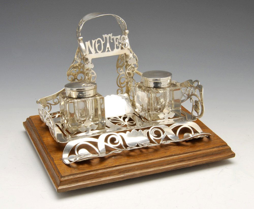 An Edwardian silver mounted ink stand.
