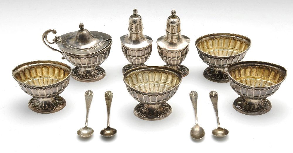 An Edwardian silver seven piece condiment set.