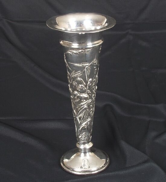 SoldSterling Silver Edwardian Trumpet VaseThis tall weighted sterling silver Edwardian trumpet vase has an almost Art Deco streamline design and is marked sterling on the bottom. It measures 18" tall x 6" across bell. It weighs 953.6 grams.See Sold Price