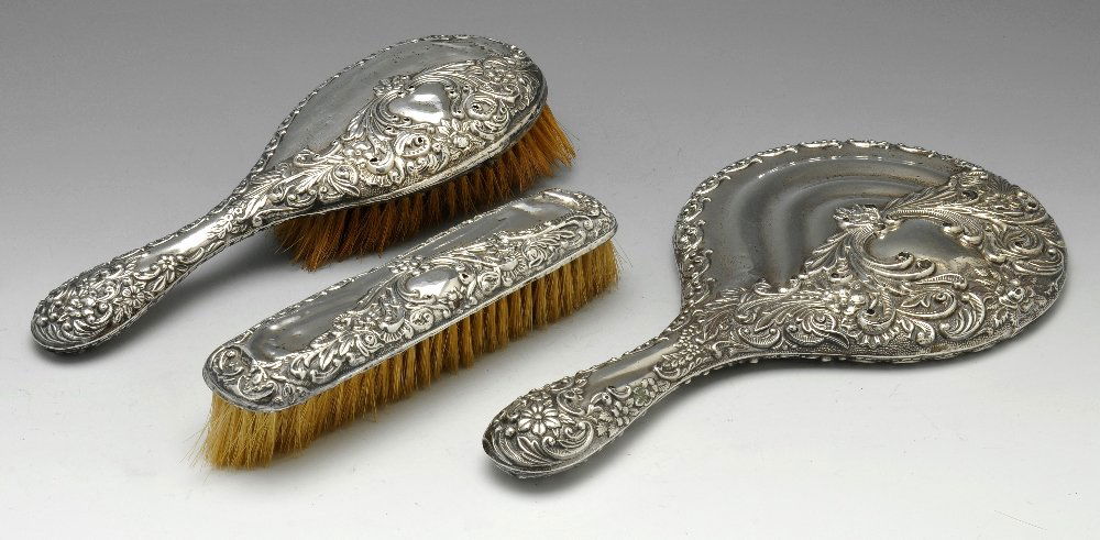 An English Birmingham A Bros. Ltd. sterling and violet guilloche enamel enameled four piece dressingAn English Birmingham A Bros. Ltd. sterling and violet guilloche enamel enameled four piece dressing table set, comprising (1) hand mirror, 11"l; (1) brush, 9"; (1) brush, 6.5"l; with (1) comb 7.25"l.