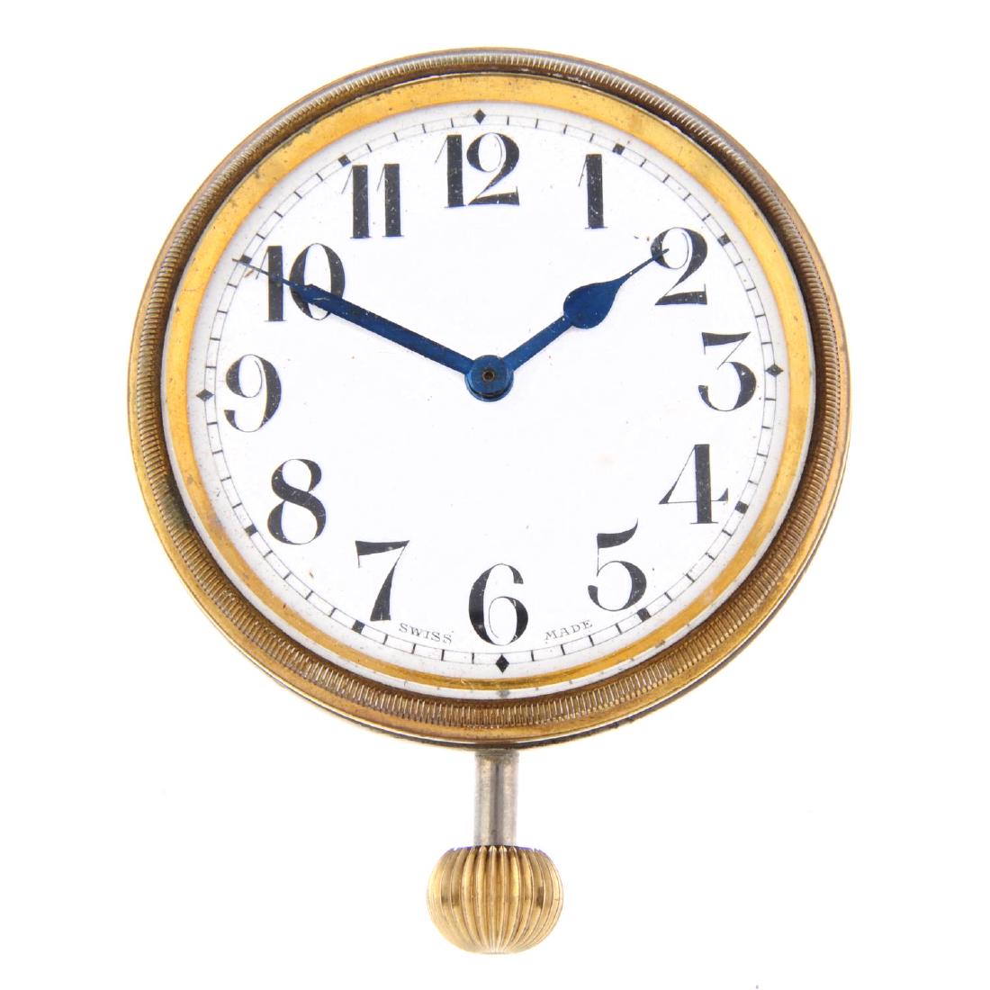 An eight day travel clock. Base metal case. Unsigned