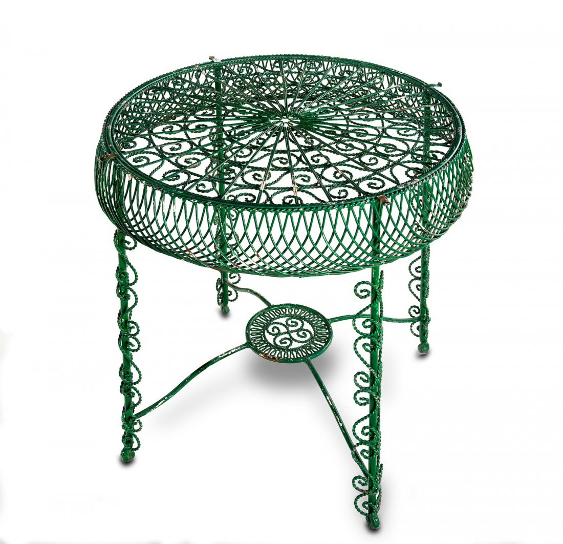 An elaborate round green painted wirework table,