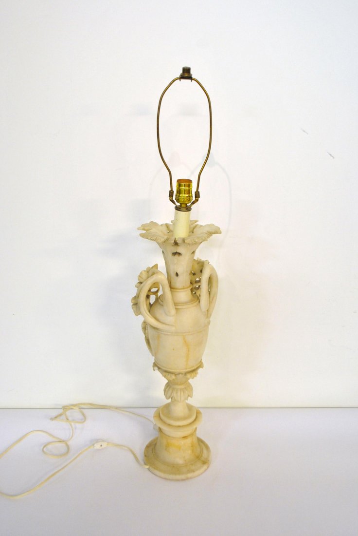SoldOrnate Alabaster Table Lamp with Sculptural HandlesA stunning vintage alabaster table lamp featuring an elegant baluster form with intricately carved handles. The piece boasts a delicately scalloped top and beautifully polished alabaster, enhancing itSee Sold Price