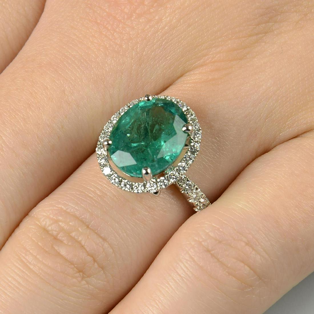 SoldAn emerald and diamond cluster ring. The oval-shapeAn emerald and diamond cluster ring. The oval-shape emerald, with brilliant-cut diamond surround and openwork shoulders Emerald weight 5.87cts. Total diamond weight 0.46ct, stamped to band. Ring sizeSee Sold Price