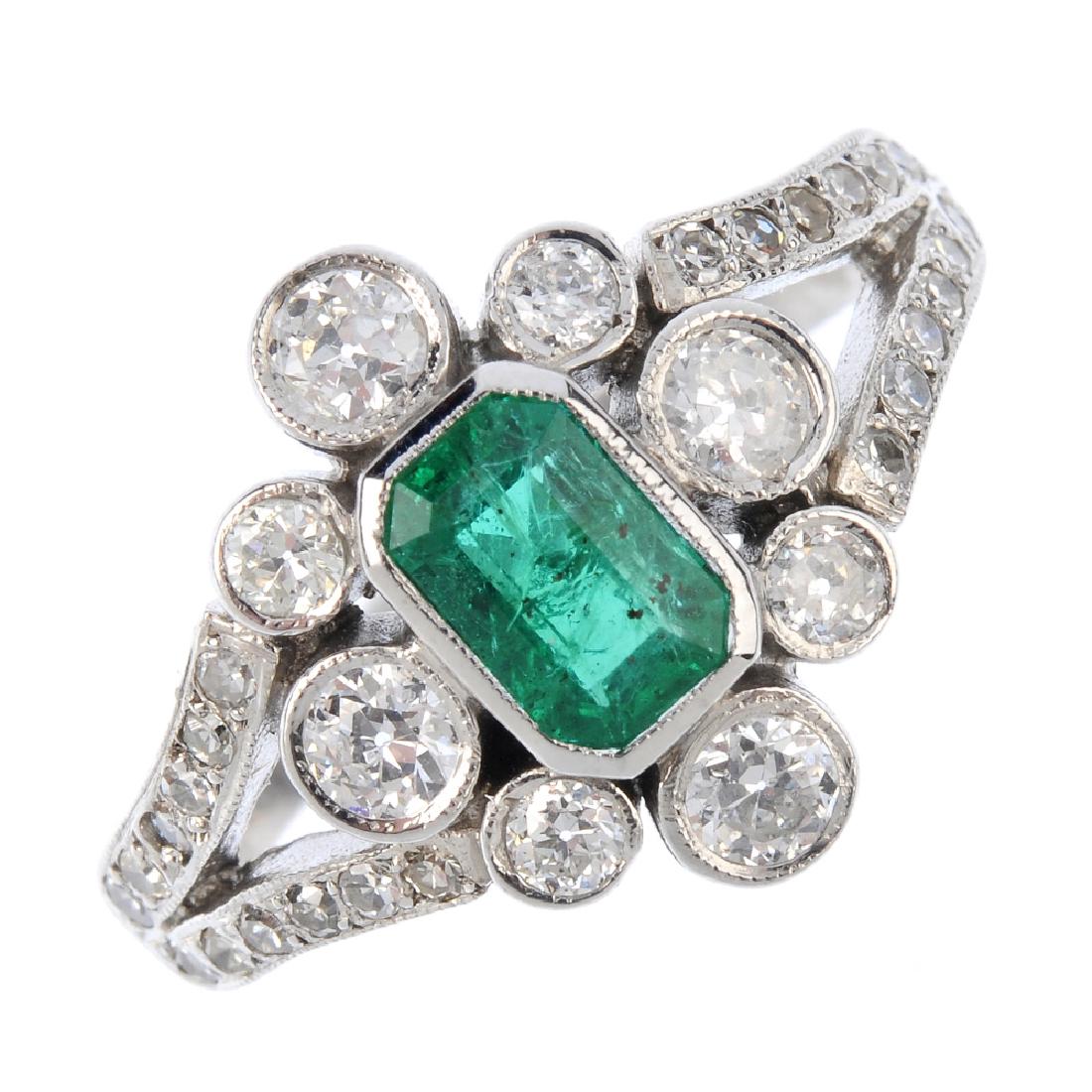 SoldAn emerald and diamond cluster ring.An emerald and diamond cluster ring. The rectangular-shape emerald collet, within an old-cut diamond surround, to the plain band. Estimated total diamond weight 0.90ct. Ring size M. Weight 3.8gms.See Sold Price