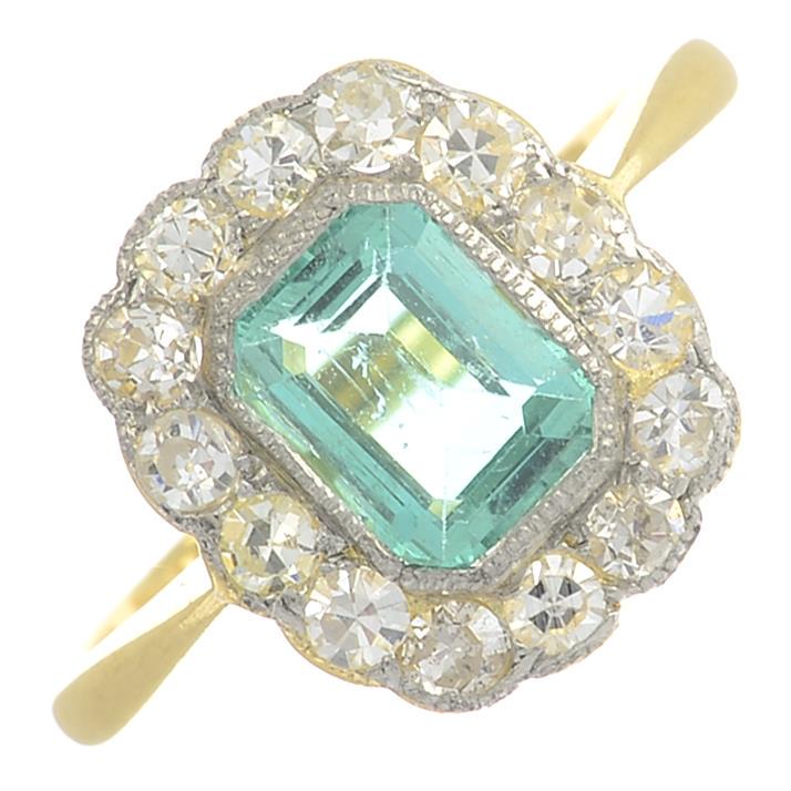 An emerald and diamond cluster ring.Emerald weight