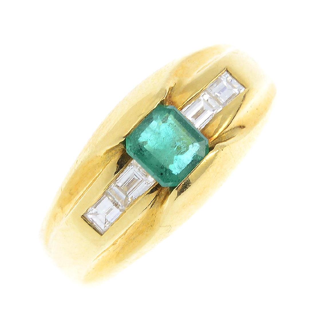 An emerald and diamond dress ring. The square-shape