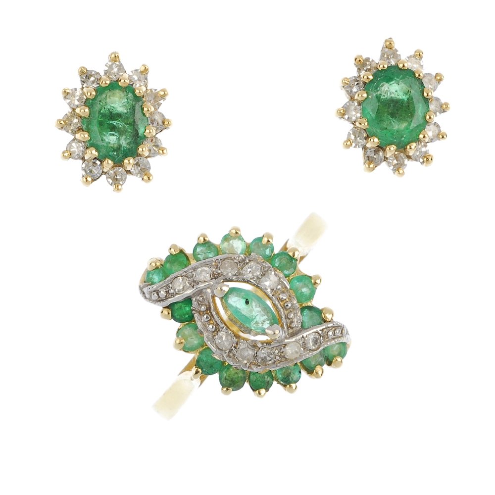 An emerald and diamond ring and ear studs.