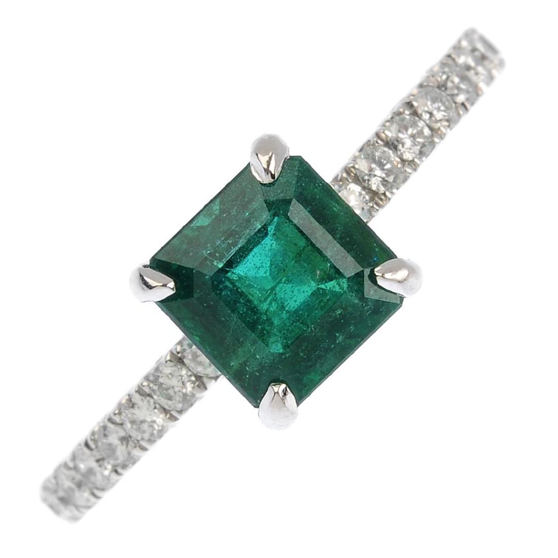 SoldAn emerald and diamond dress ring. The square-shapeAn emerald and diamond dress ring. The square-shape emerald collet, with brilliant-cut diamond sides. Ring size L. Weight 5.3gms.See Sold Price