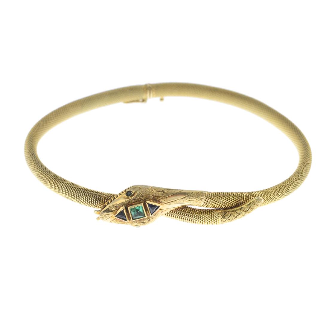 AN ANTIQUE VICTORIAN SAPPHIRE, GEMSTONE AND DIAMOND SNAKE BANGLE in yellow gold, designed as two coiAN ANTIQUE VICTORIAN SAPPHIRE, GEMSTONE AND DIAMOND SNAKE BANGLE in yellow gold, designed as two coiled snakes, one snake's head set with a cushion cut red stone in a surround of rose cut diamonds, th