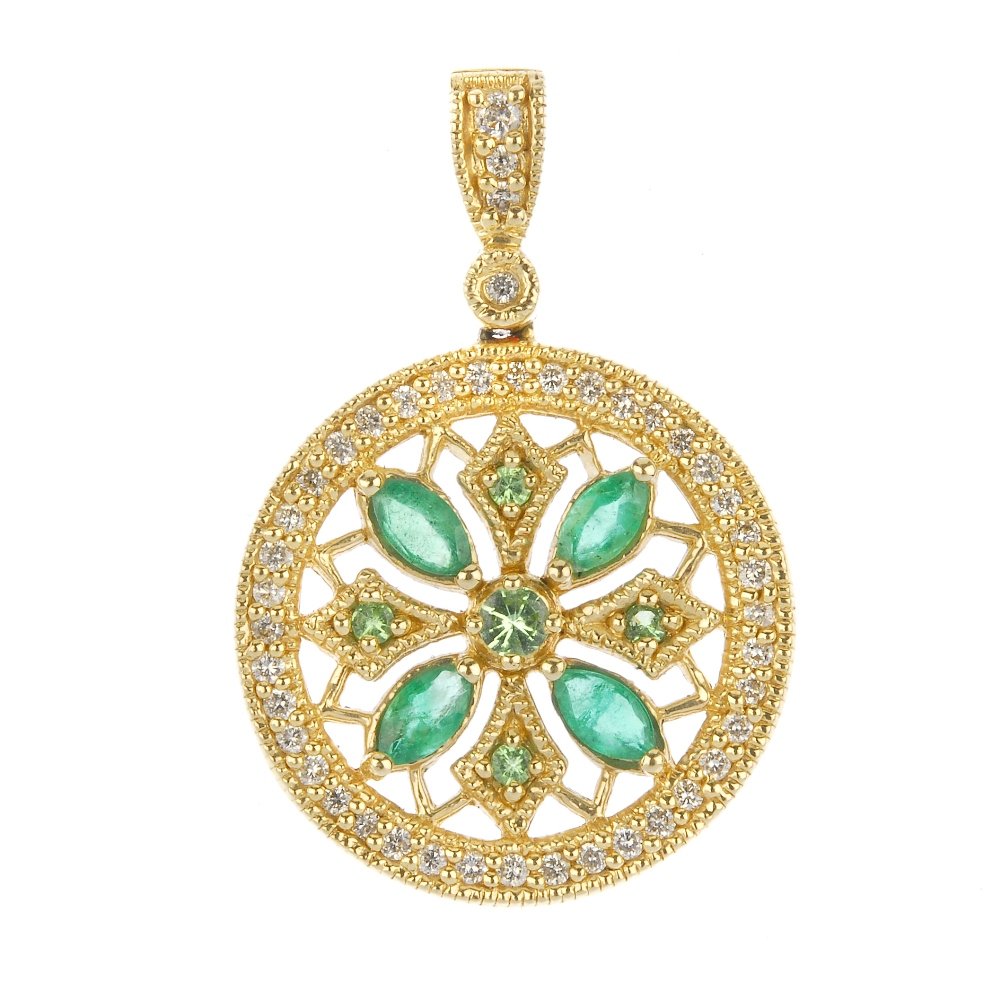 An emerald, diamond and gem-set pendant.