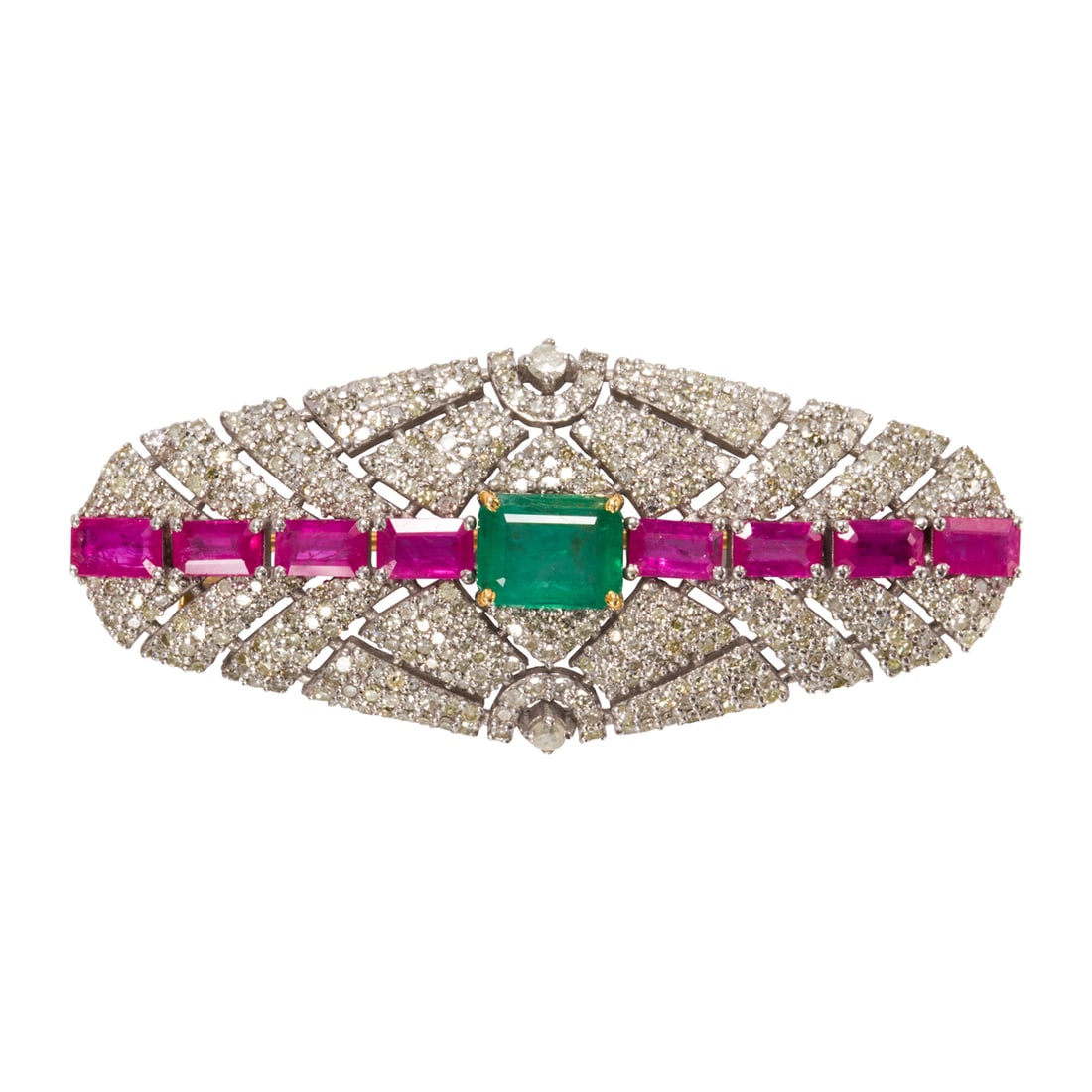 An emerald, diamond, ruby, silver, and 14k gold brooch
