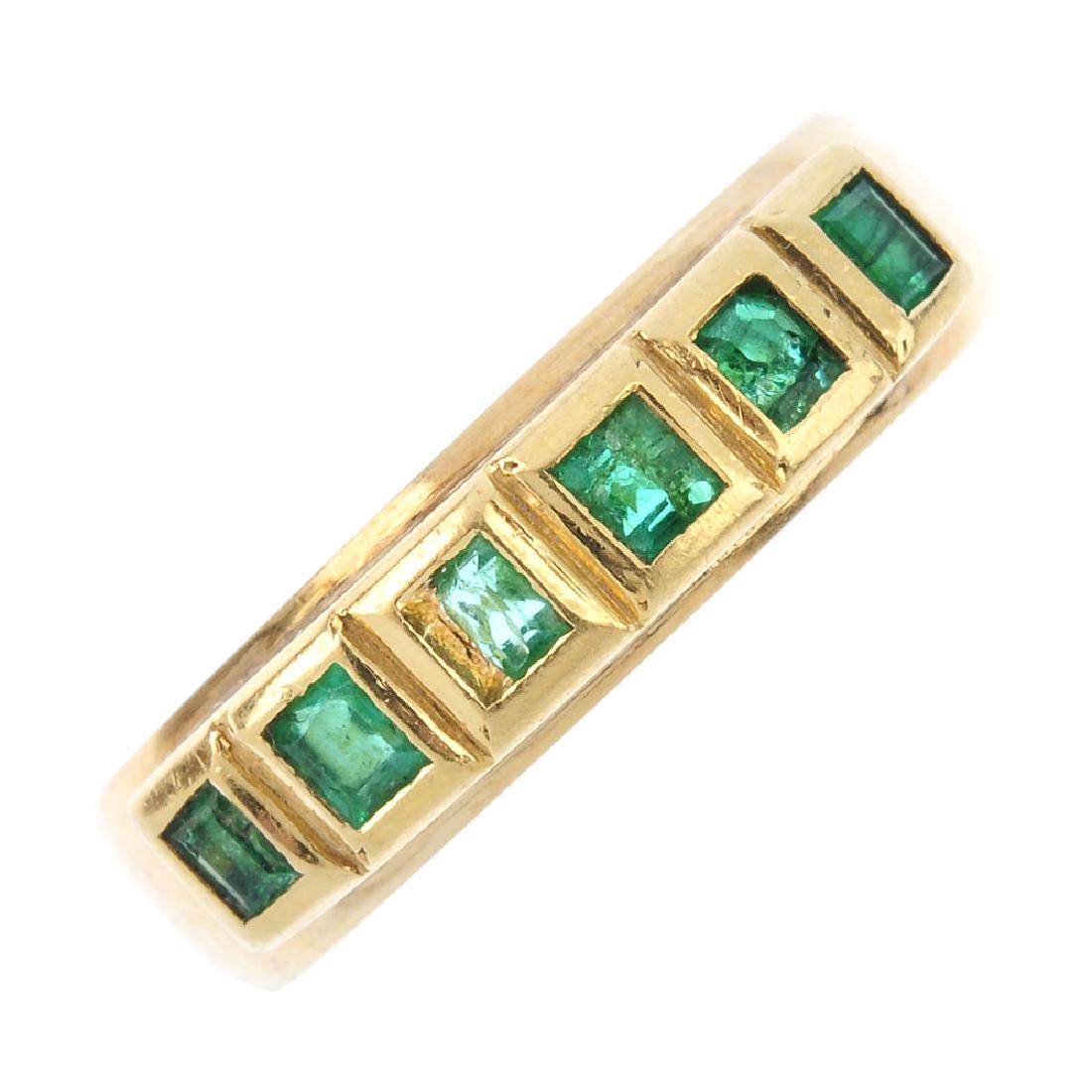 An emerald seven-stone ring. The rectangular-shape