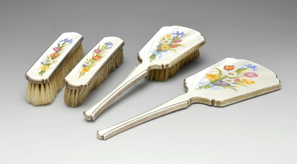 An enamelled silver dressing table set.