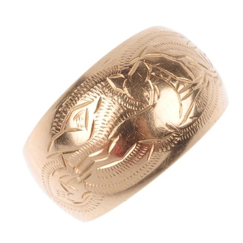 A group of five rings; the first an engraved band ring centred with a flower motif, grain set with fA group of five rings; the first an engraved band ring centred with a flower motif, grain set with five rose-cut diamonds, size M ½, surface tested as 14ct; the second a plain band ring, size J &