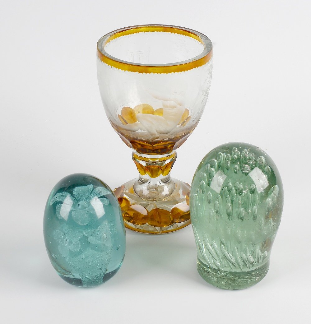 An etched glass goblet, plus two paperweights