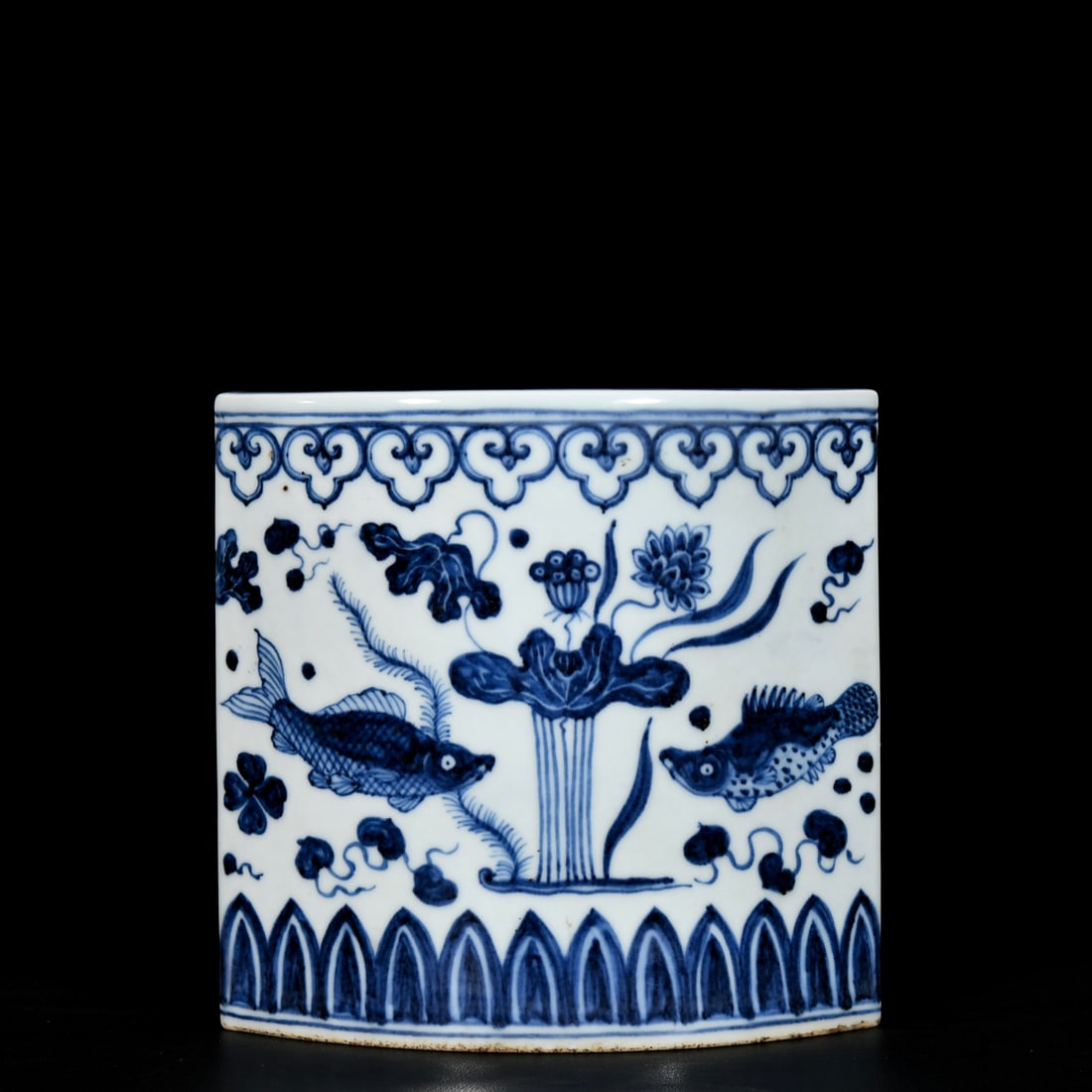 An Exquisite Blue and White Fish and Algae Pattern Brush Pot