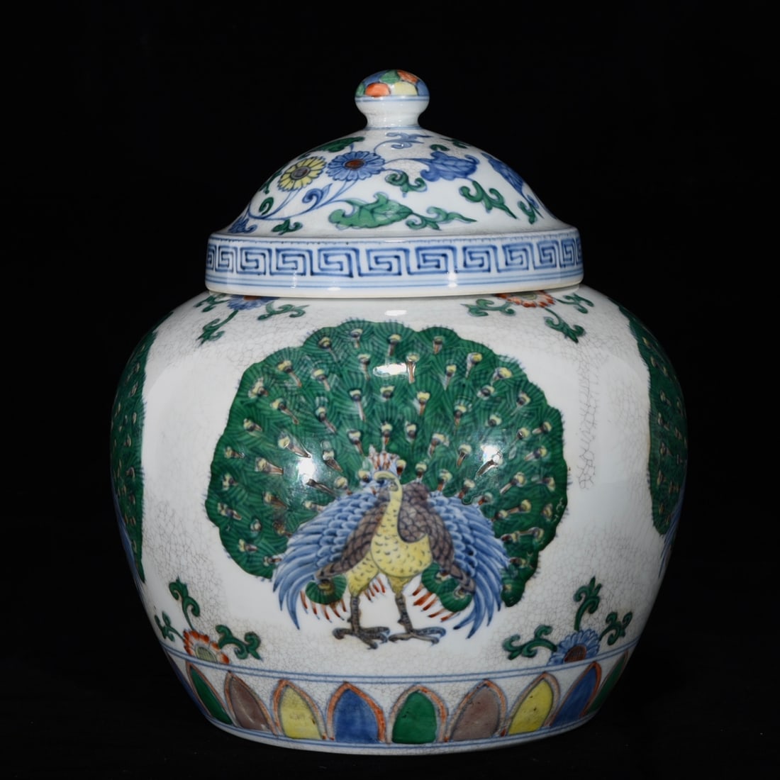 An Exquisite Doucai Peacock Pattern Cover Jar