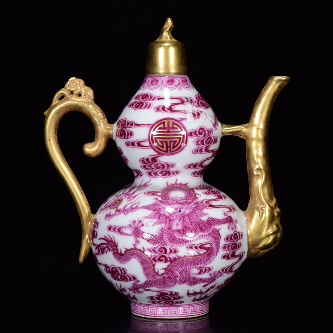 An Exquisite Ruby Red-Glazed Gilt Auspicious Cloud and Dragon Pattern Gourd-Shaped Ewer