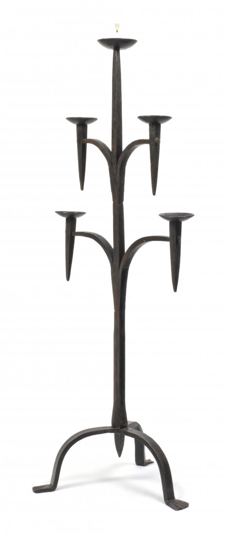 SoldArts & Crafts Wrought Iron 5-Light Pricket StickArts and Crafts Wrought Iron Five-Light Pricket Stick, with scrolling arms in three tiers, above a circular hammered base supported by three spherical feet. 12" H x 19.5" W. Provenance: From a ManhattSee Sold Price