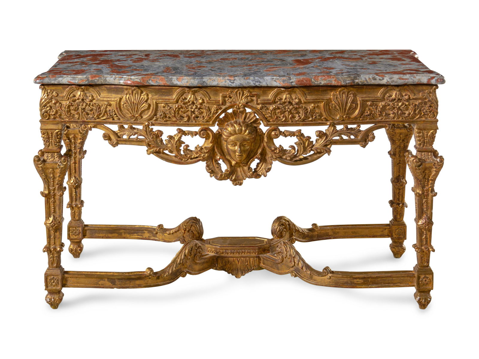 SoldLOUIS XIV-STYLE GILTWOOD MARBLE TOP CONSOLE TABLEHilda Flack Interiors (American, b. 1943), contemporary. Italian crafted carved giltwood and green decorated console or center table in the Louis XIV baroque taste, having a green marble top, scrolledSee Sold Price