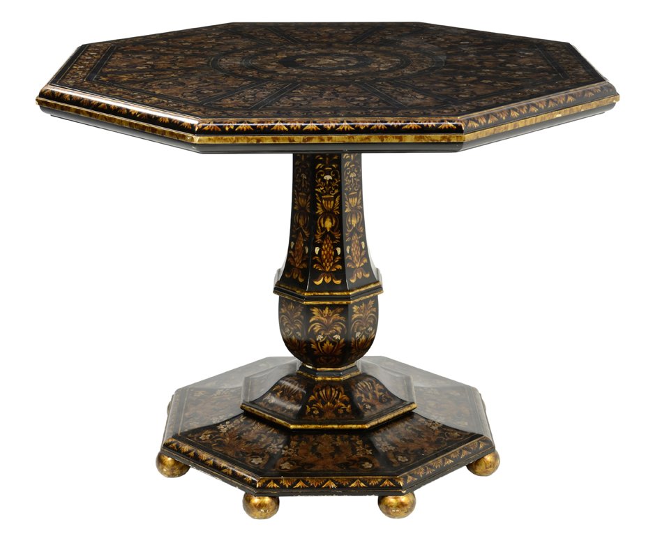 AN OCTAGONAL GILT AND BLACK PAINTED PEDESTAL TABLE