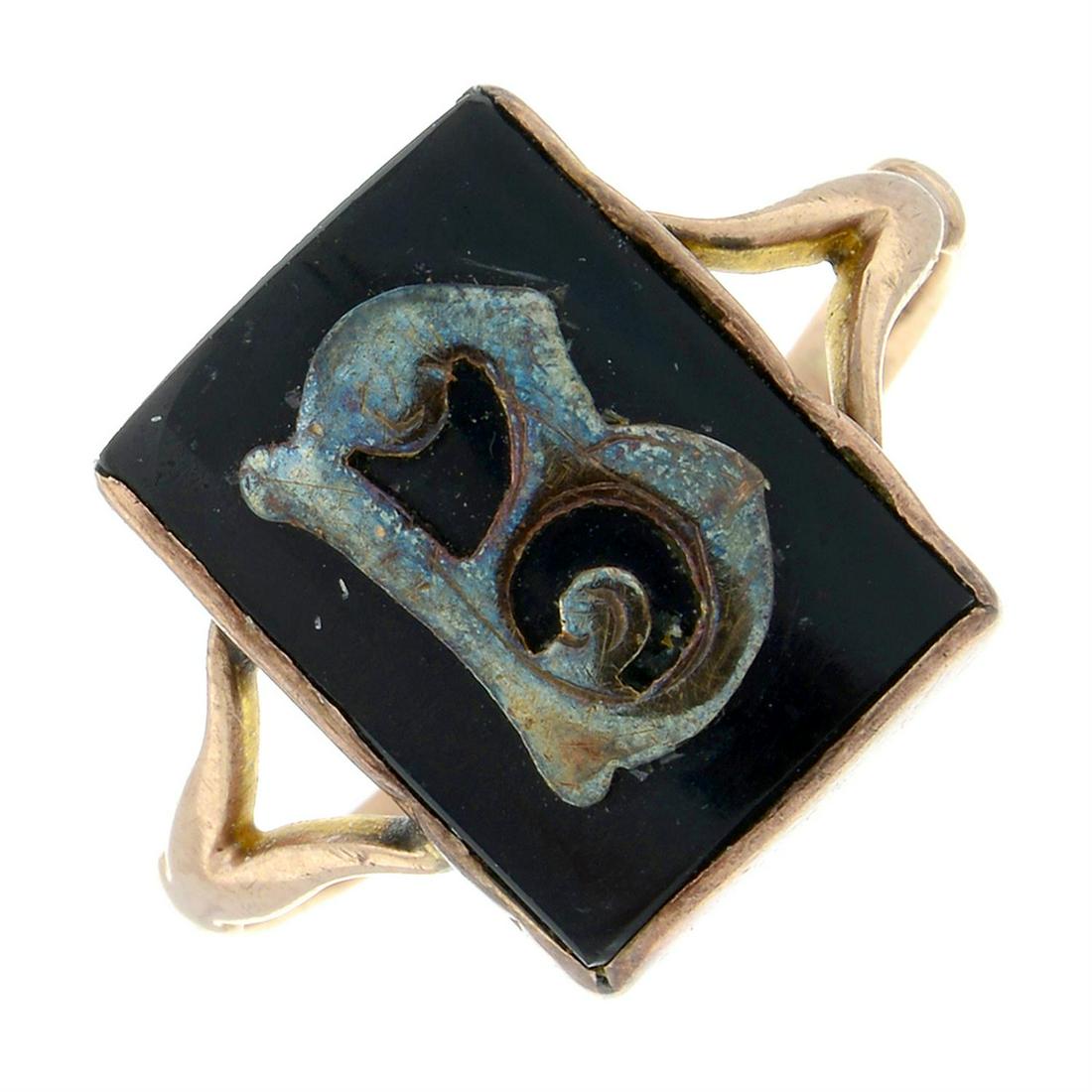 An onyx initial 'B' signet ring.