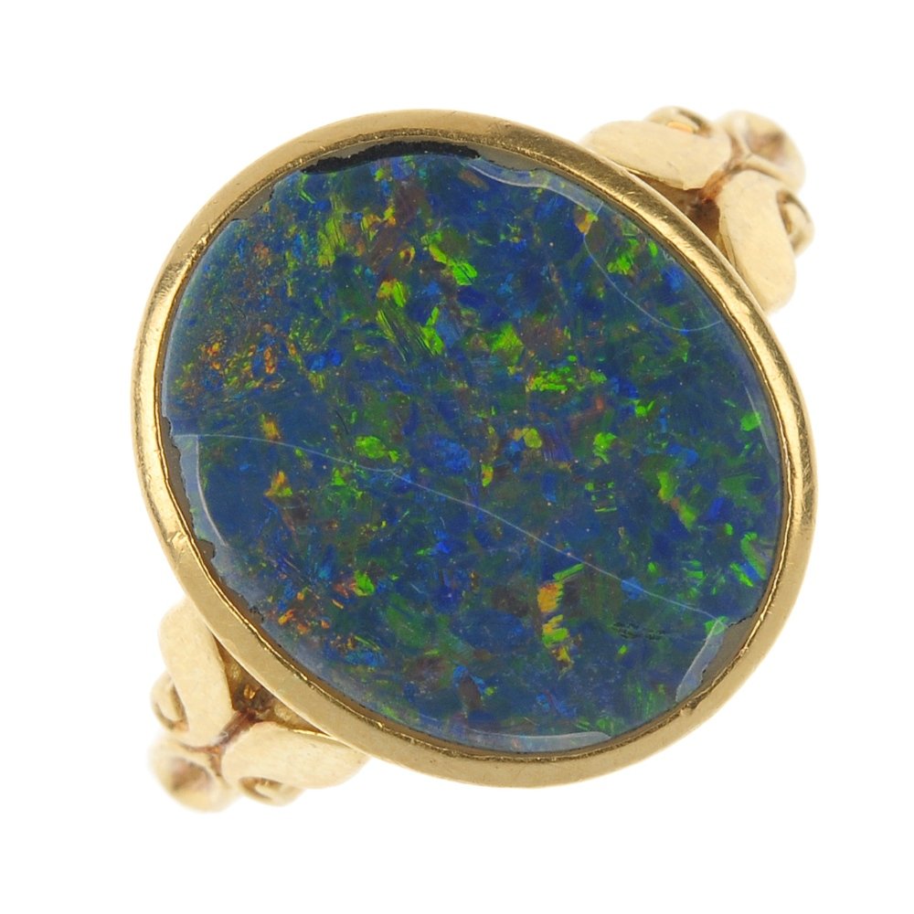 SoldAn opal single-stone ring.An opal single-stone ring. The oval opal doublet collet, with polished surround, to the trifurcated shoulders. Ring size T. Weight 4gms.See Sold Price