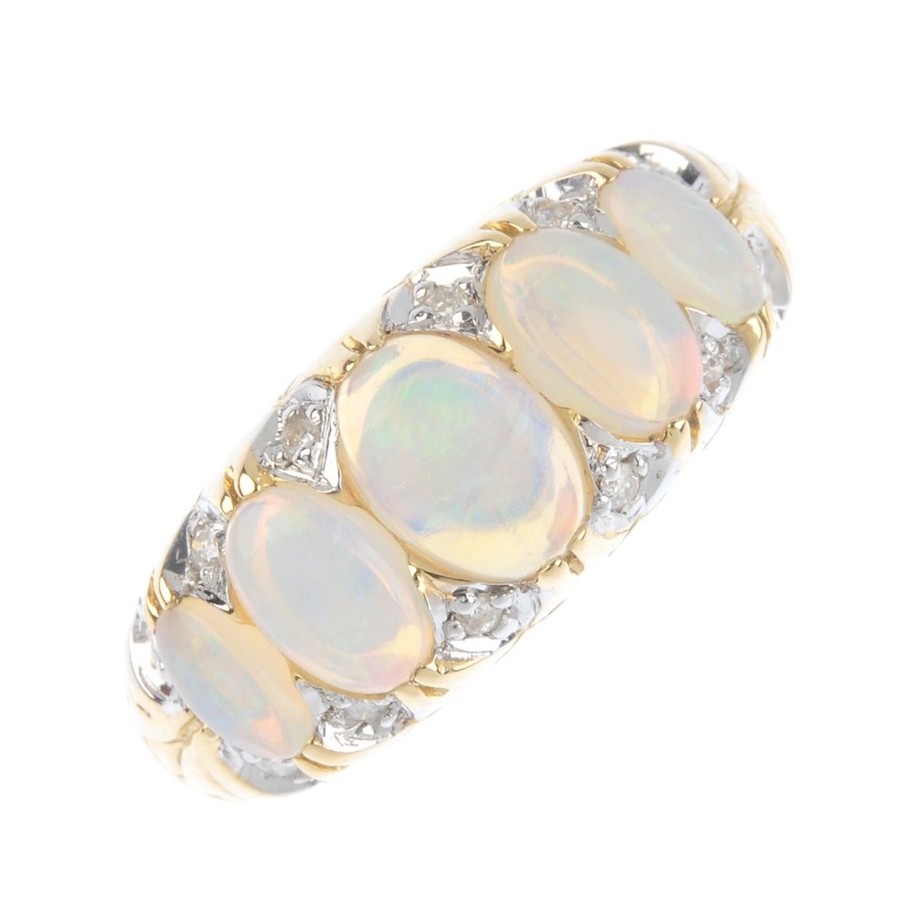 SoldA late Victorian 18ct gold opal five-stone ring. TheA late Victorian 18ct gold opal five-stone ring. The graduated oval opal cabochon line, with rose-cut diamond spacers. Hallmarks for Birmingham, 1896. Ring size O1/2. Weight 4.4gms.See Sold Price