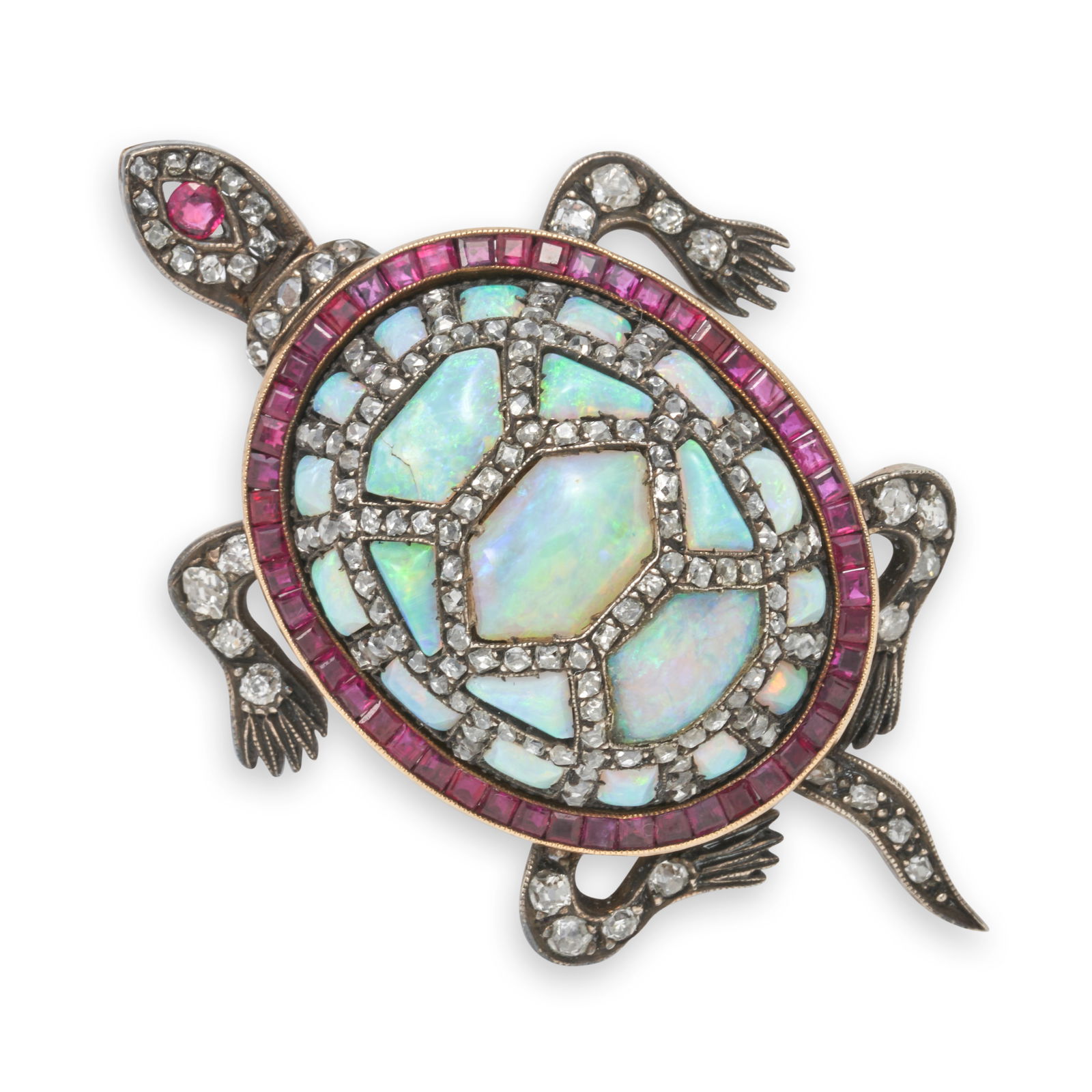 AN OPAL, RUBY, AND DIAMOND TURTLE BROOCH, AUSTRIA