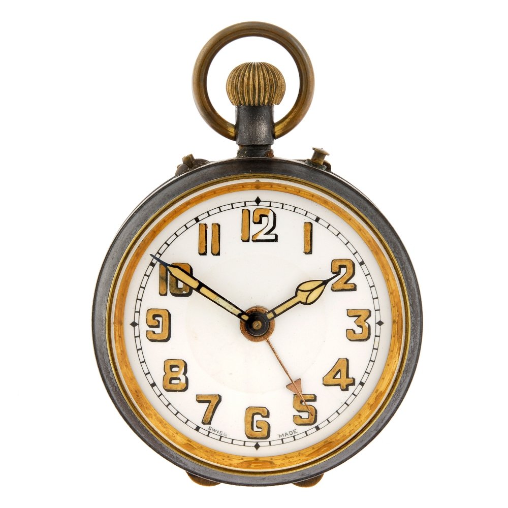 An open face alarm pocket watch.