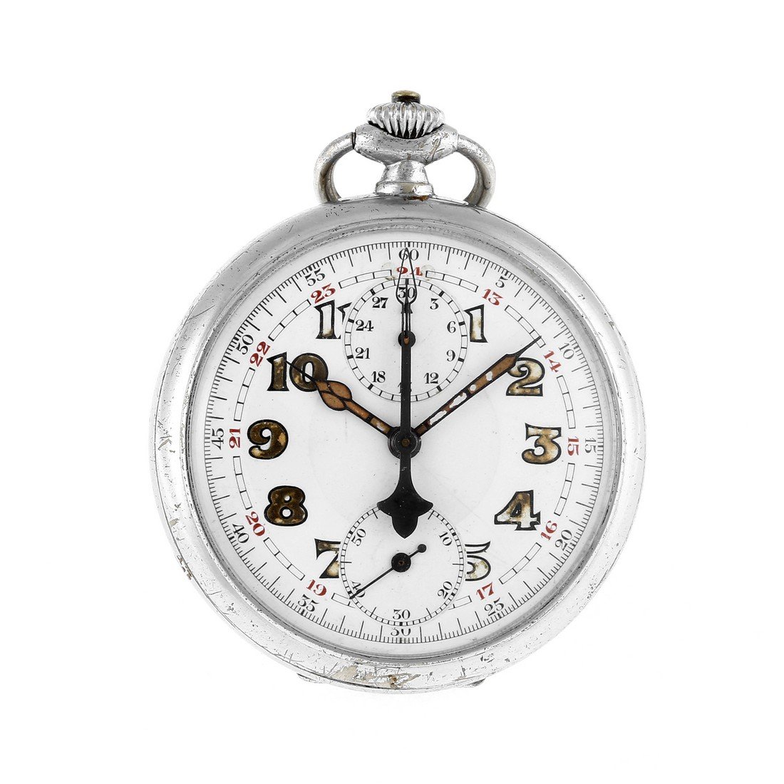 SoldOpen face pocket watch with chronograph on the rearOpen face pocket watch with chronograph on the rear side in silver, Switzerland around 1880, smooth, on both sides glazed case dent, enamel dial with Roman numerals, constant second at 6, blued steelSee Sold Price