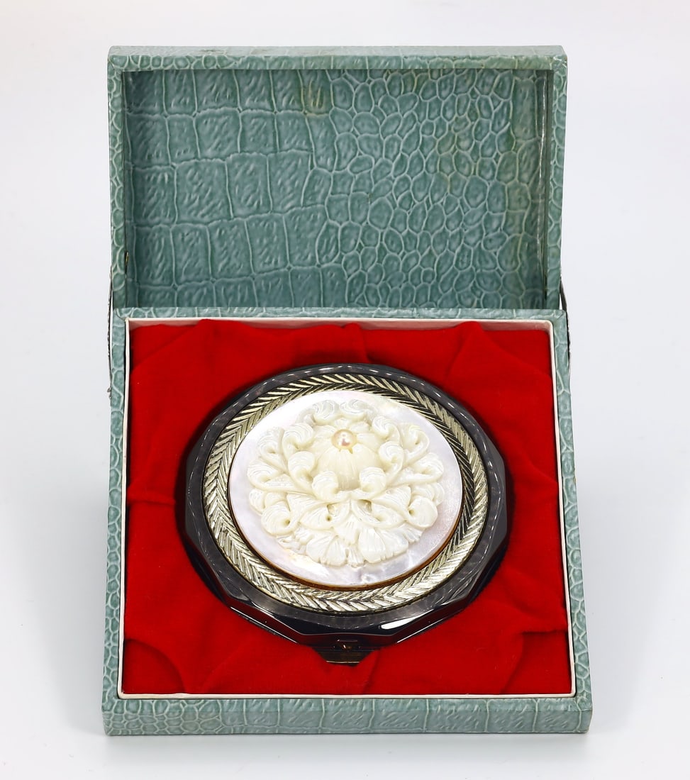 An Oriental Shell Carved Flower Design Powder Compact