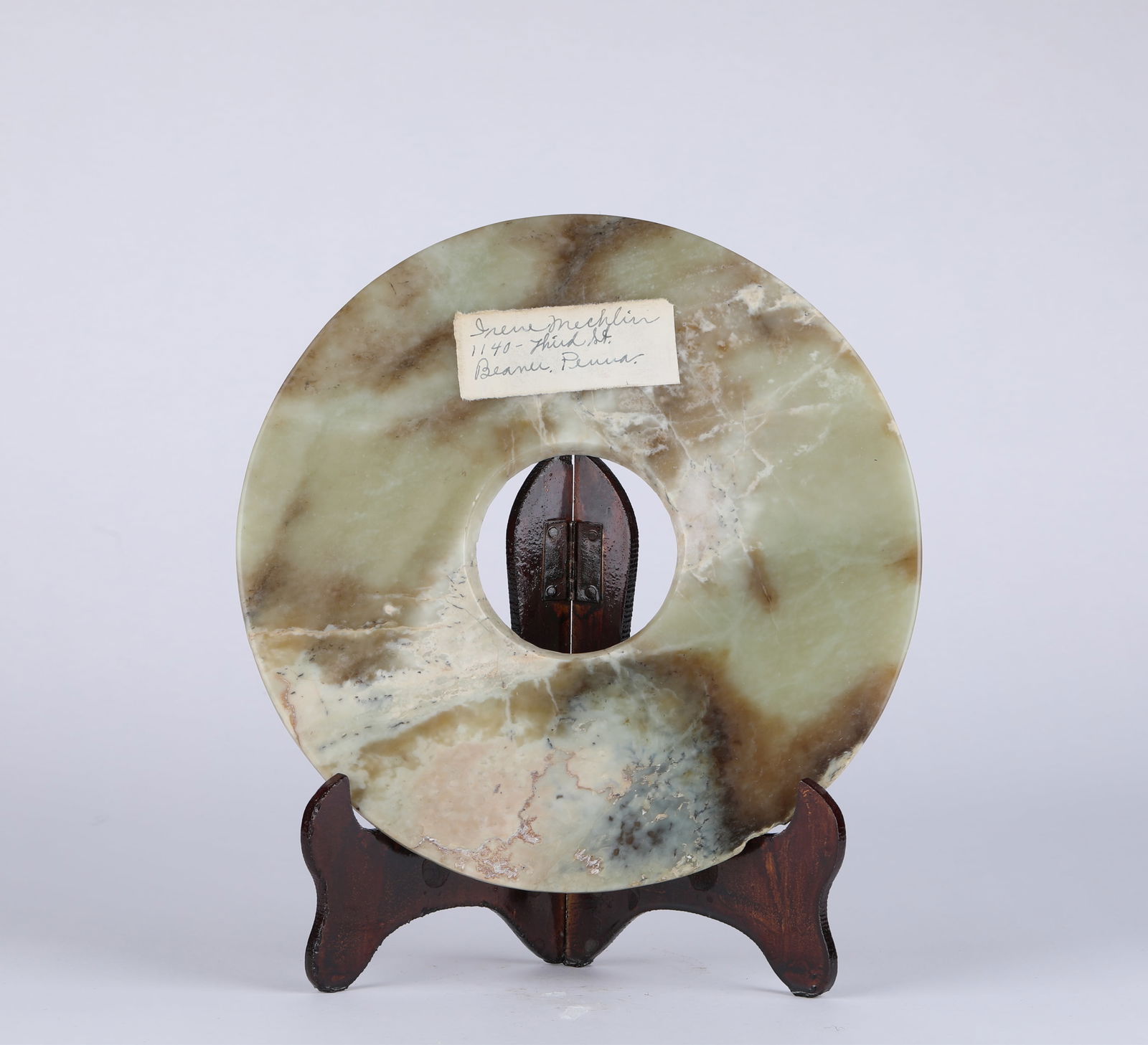 SoldLarge Ancient Chinese Jade Bi DiscAncient Jade Bi Disc. Likely 3500 BC. Provenance: Ex- collection of Bernard Spain (Philadelphia, PA). Important 5th Avenue New York City Private collection. Comes with copy of original receipt. DiametSee Sold Price