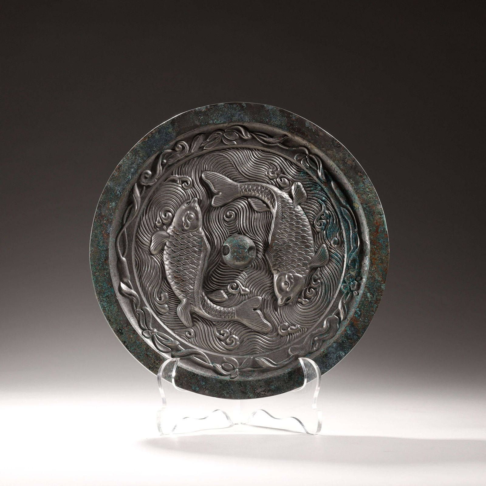 Ancient copper mirror with fish and algae patterns