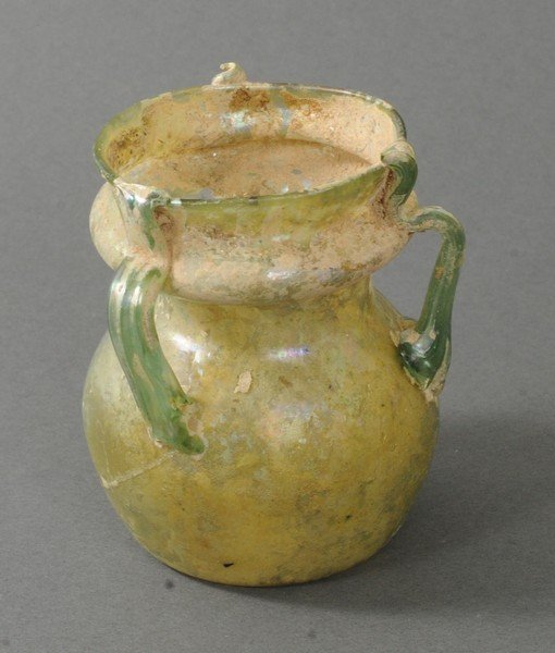 ANCIENT ROMAN THREE HANDLE GLASS FLASK