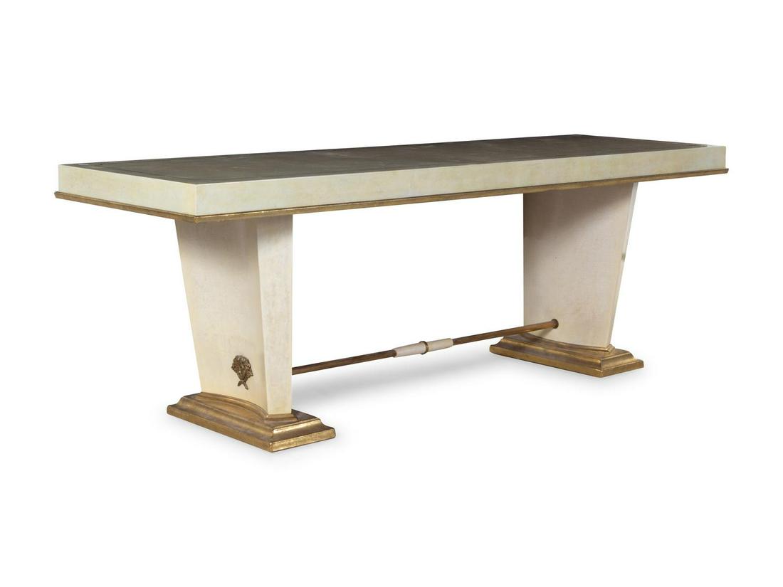 AN EBONIZED WOOD AND GILTWOOD DOUBLE PEDESTAL DINING ROOM TABLE IN THE MANNER OF JAMES MONT CKamelot Auctions4.4(345)$1,2006 days Left