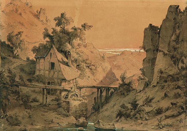ANDREAS ACHENBACH: Berglandschaft mit Mühle.