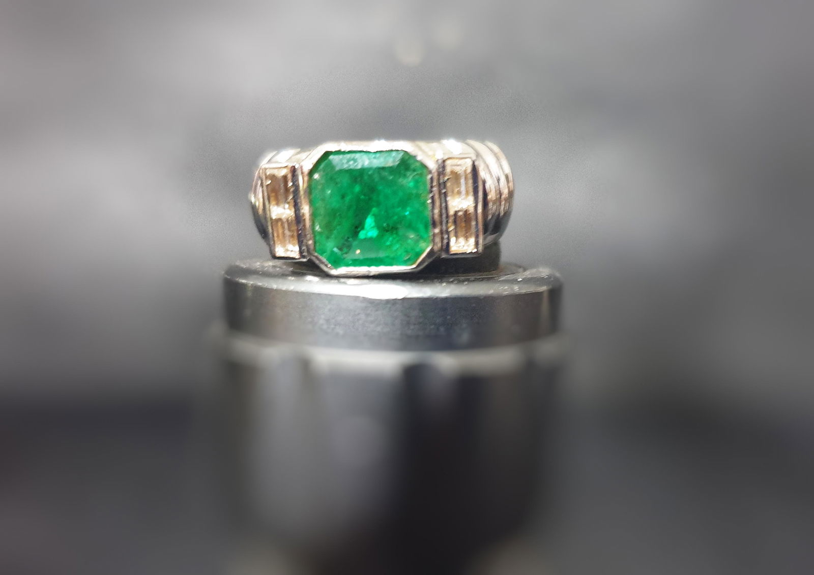 SoldAnello oro bianco, con smeraldo ottagonale ct. 3,75Anello oro bianco, con smeraldo ottagonale ct. 3,75 circa, e due diamanti triangolari. g. 3,90, misura 14/54 White gold ring with octagonal emerald and two triangular diamondsSee Sold Price