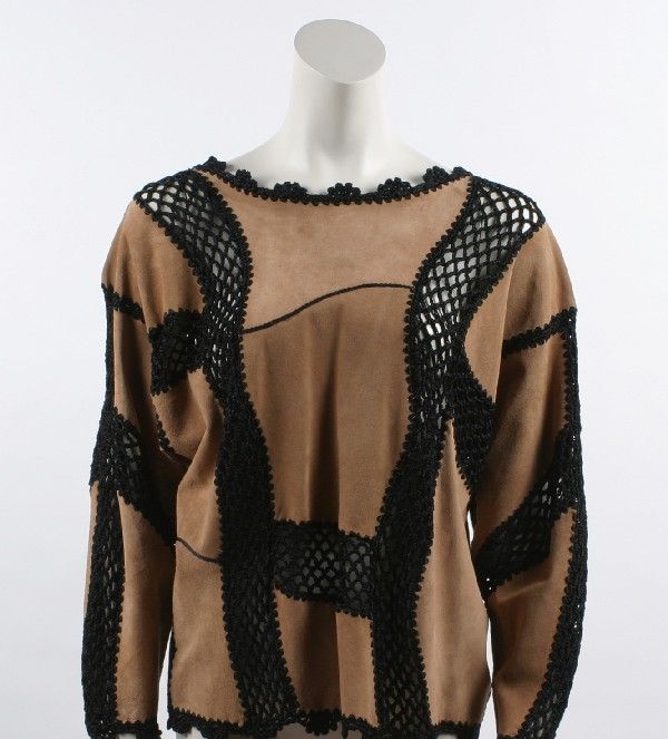 SoldJan Faulkner Embellished Brown Suede BlouseJan Faulkner brown suede blouse embellished with fringe, cabochons and crocodile print appliques, lacking size label. Collar to hem 32.5", across shoulders 17.5", across chest 18.5", shoulder to cuffSee Sold Price