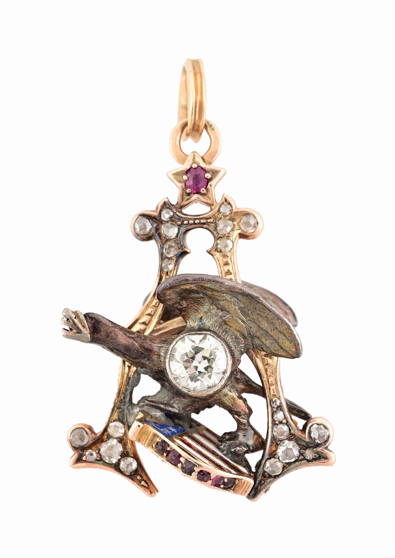 SoldANHEUSER BUSH DIAMONDS AND RUBY SILVER EAGLE PENDANTPre-Prohibition. Early 1900s. Difficult to find larger 14k gold and silver version of the Anheuser Busch soaring eagle watch fob on gold AB "A" logo. Pendant is surrounded by diamonds and rubies. BrigSee Sold Price
