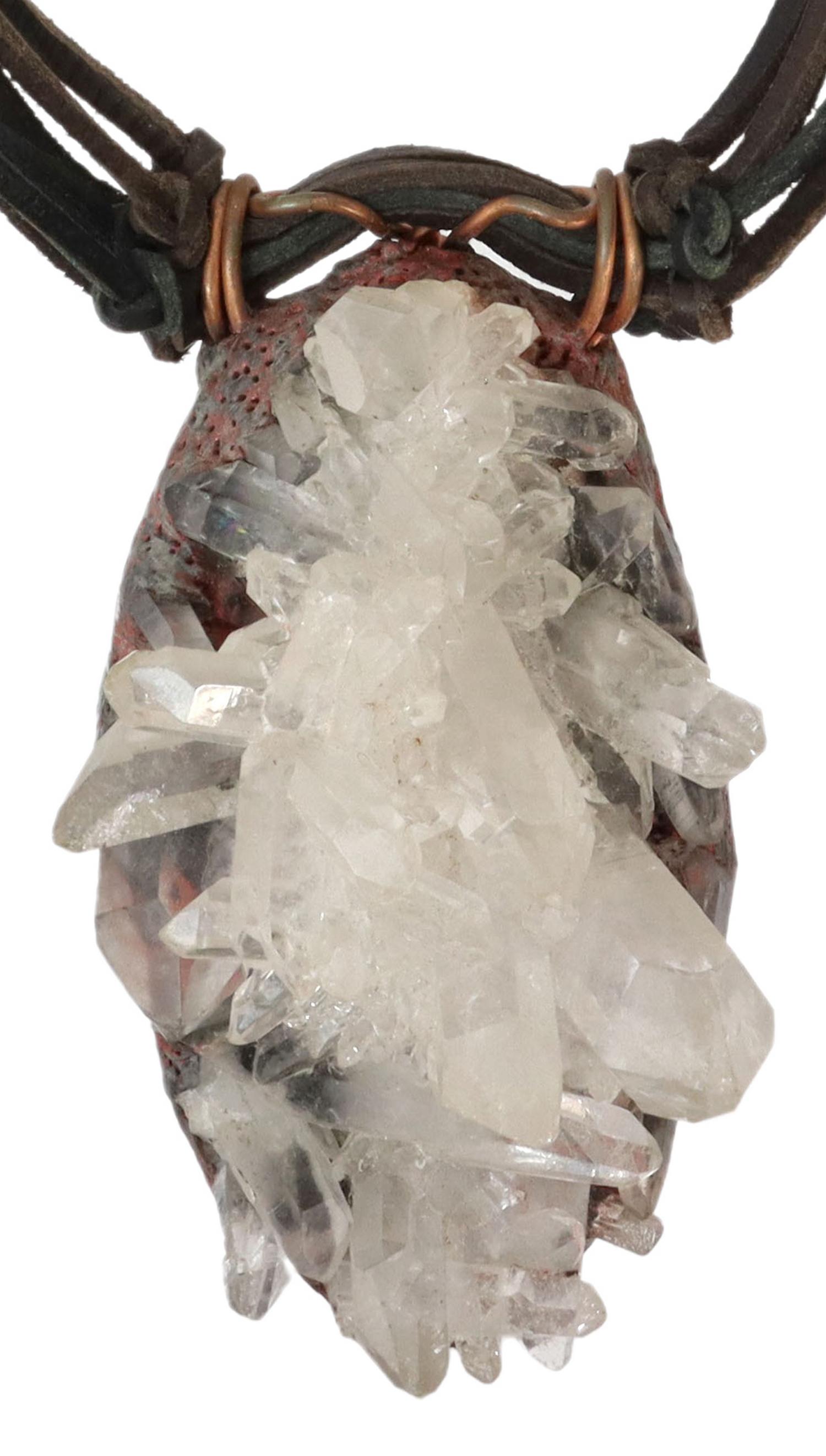 SoldANOTHAI HANSEN STATEMENT NECKLACE, CRYSTAL CLUSTERArtisan one-of-a-kind wearable art statement necklace, Anothai Hansen (Thailand/ New York, 20th c.), a 4.5" clear crystal quartz cluster pendant, hung with copper wire from six brown and black cords,See Sold Price